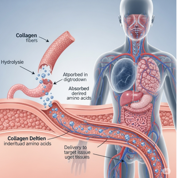 콜라겐은 단백질의 일종으로, 섭취하면 소화 과정에서 아미노산으로 분해됩니다.